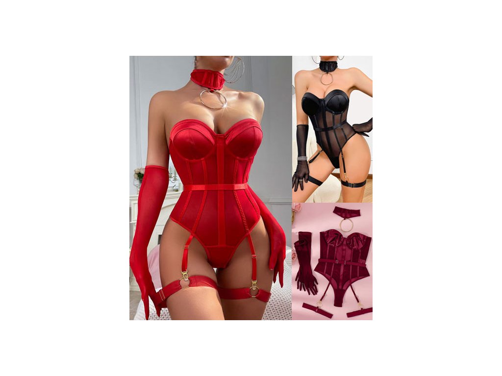 Set obsahuje: body s podvazky + rukavičky + obojek + 2x stehenní podvazek (místo nich lze připnout punčošky).