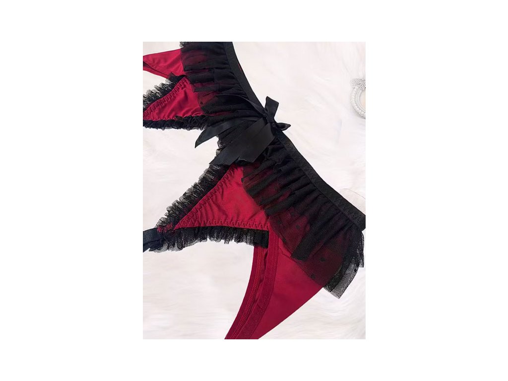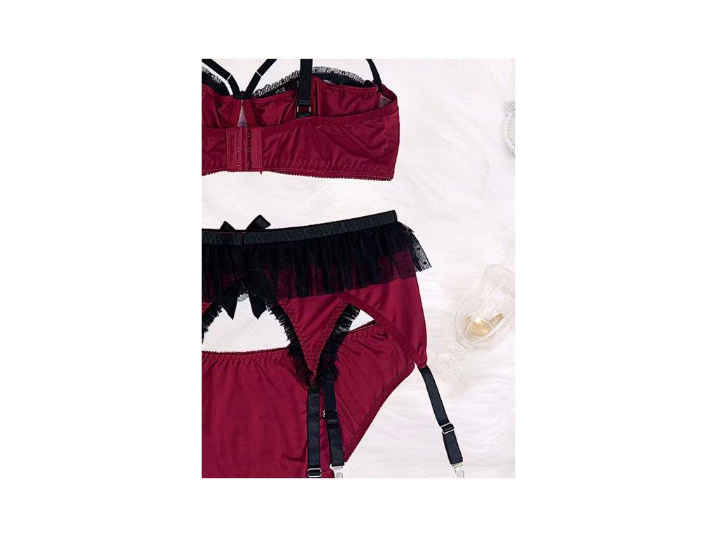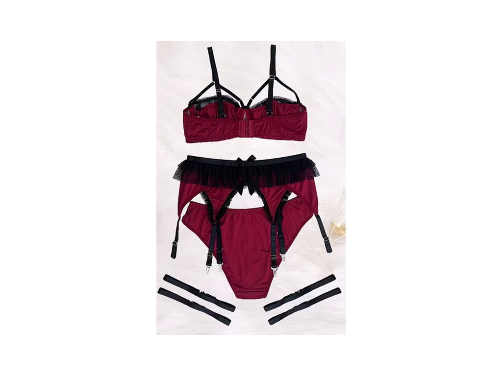 Set obsahuje: podprsenka + podvazkový pás (6 podvazků s kovovýma přezkama) + kalhotky + 4x stehenní podvazky (místo nich lze připnout punčošky)