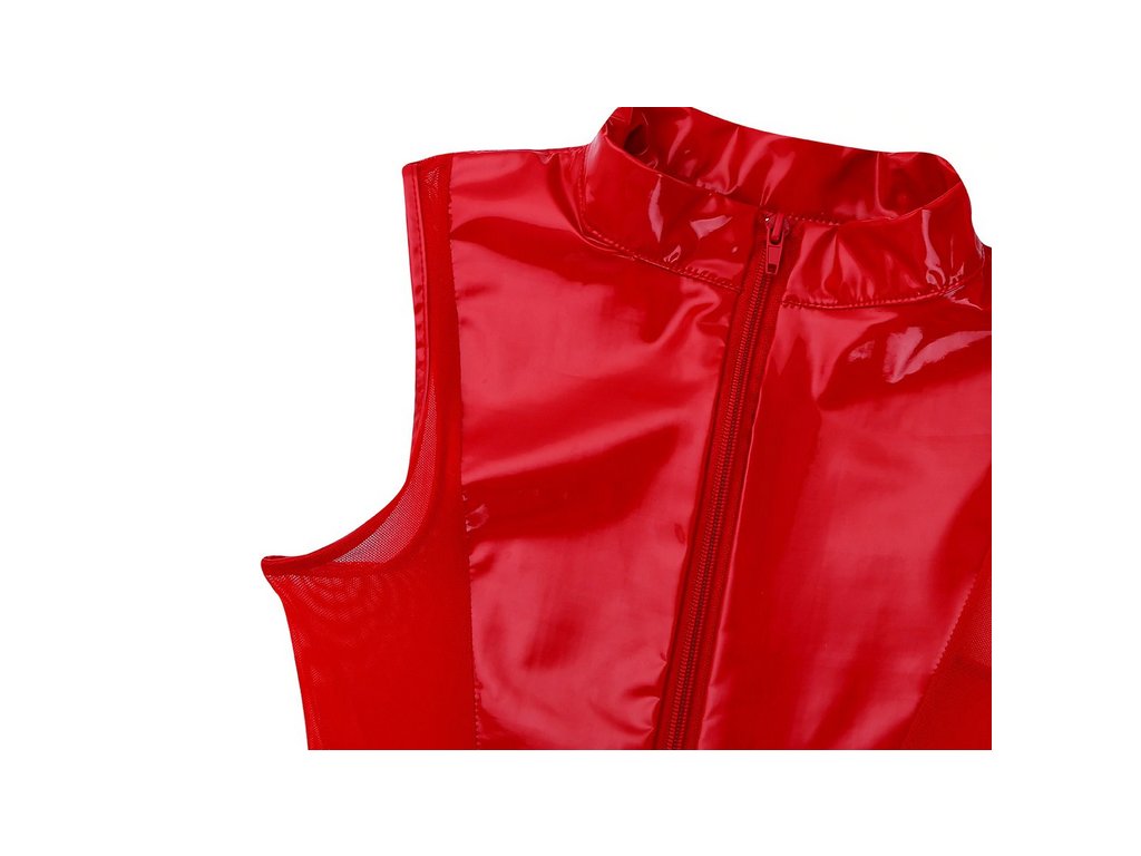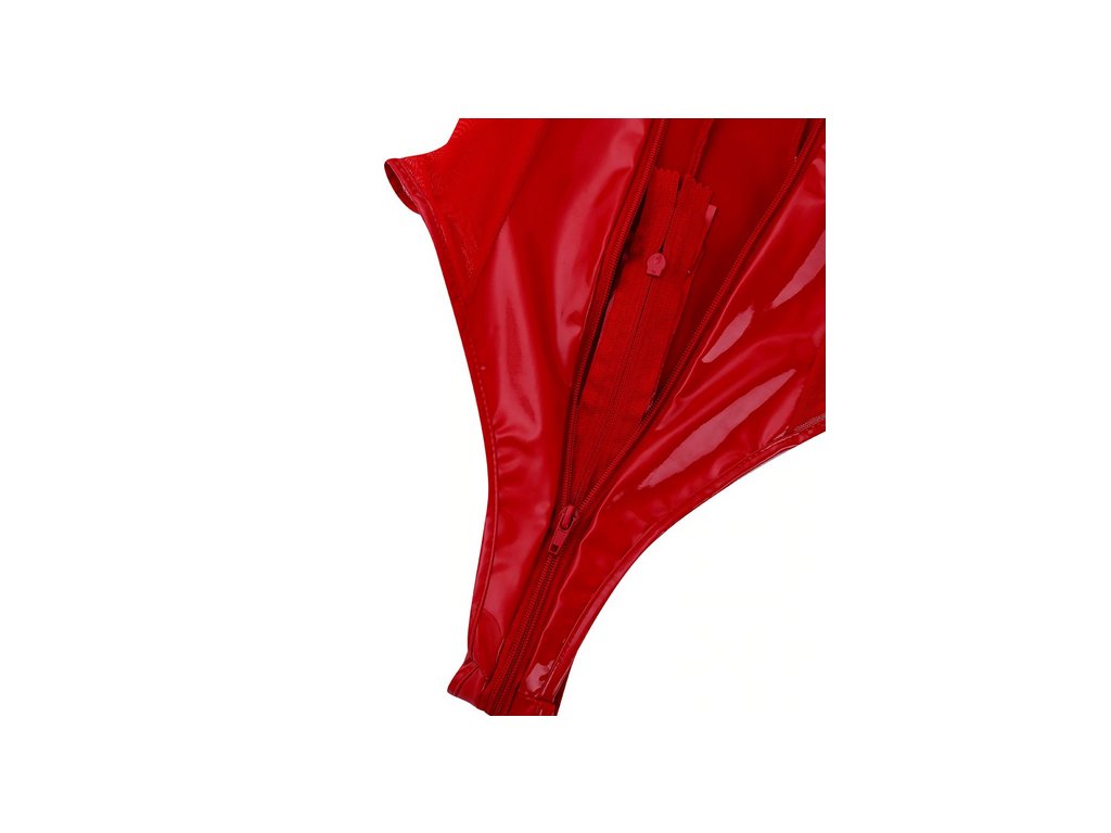 Body z lesklého spandexu s funkčním zipem v rozkroku a průhlednou síťovinou na bocích. Oblékání přes boky.
