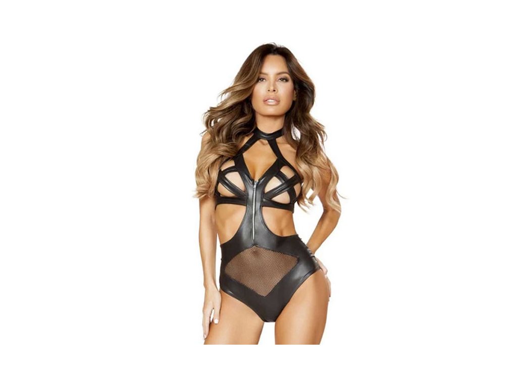 Erotické body s imitací kůže. Příjemný pružný materiál. Kvalitní provedení. Funkční zip v přední části. Součástí body jsou i nadkolenky v přední části síťované.