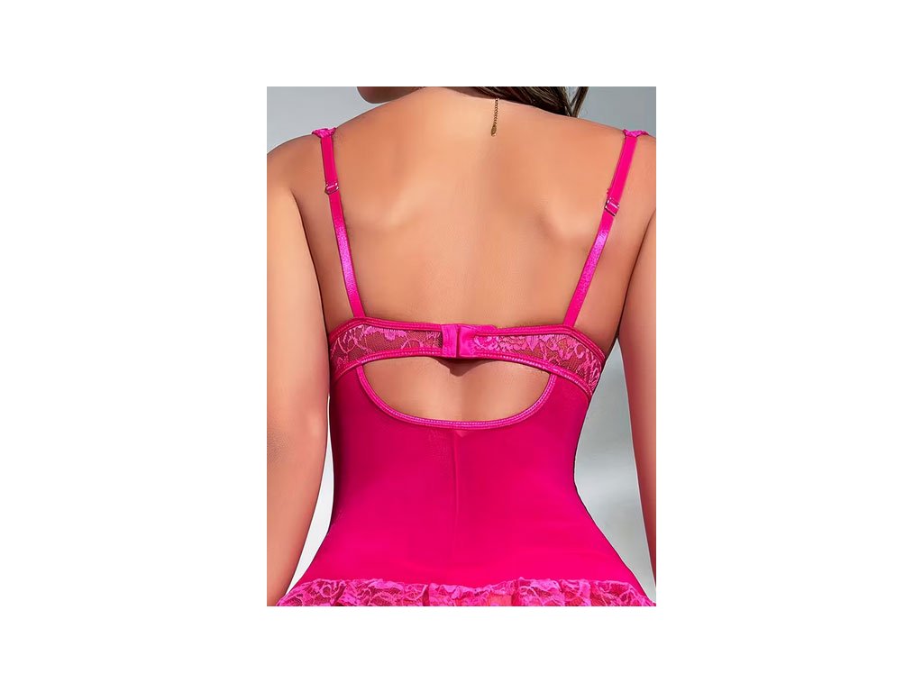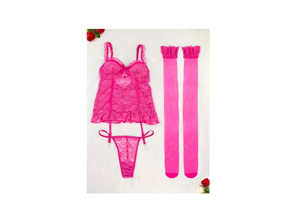 Set obsahuje: krajkový top s podvazky + tanga + punčošky v barvě setu