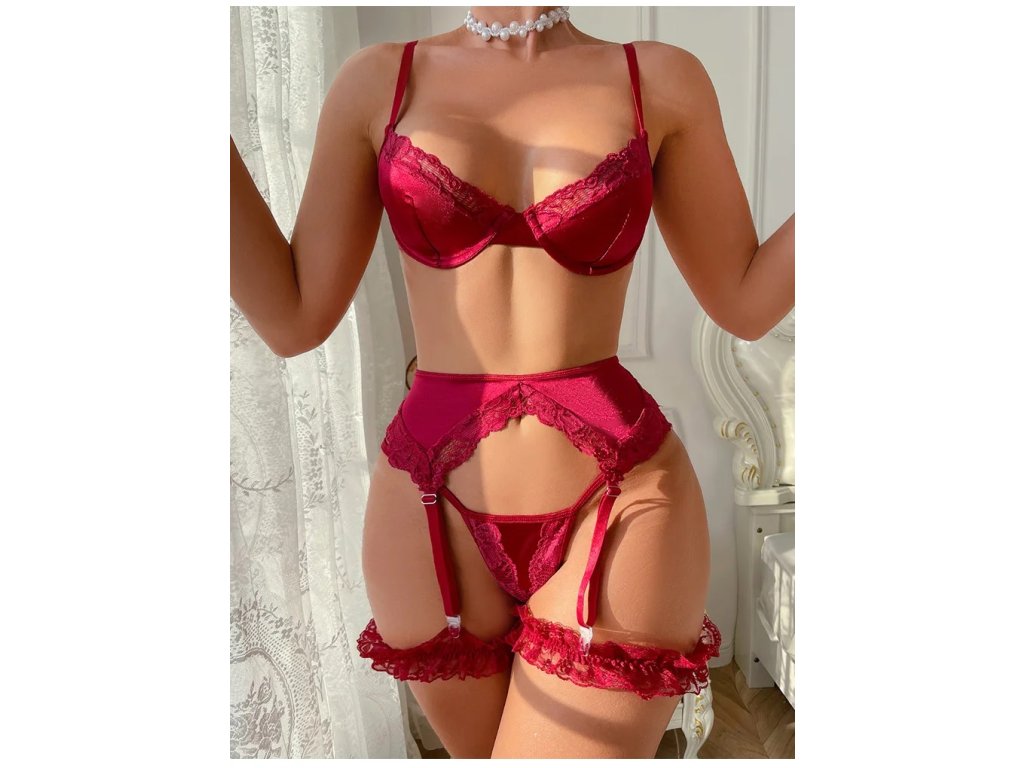 Sexy saténový komplet zdobený krajkou. Nastavitelná délka podvazků.